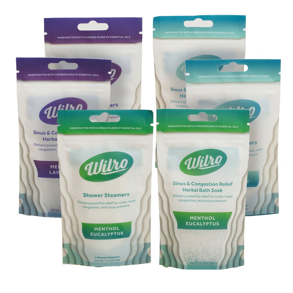Each 6-pack includes three 4-ounce bath salts and three shower steamer packs, with two of each scent.